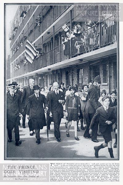 People of Shoreditch welcoming Prince of Wales (later Edward VIII and then Duke of Windsor) during his visit. The Prince accompanied by officials, is seen walking through Windsor House, council estate in Wenlock Road, Shoreditch, London.